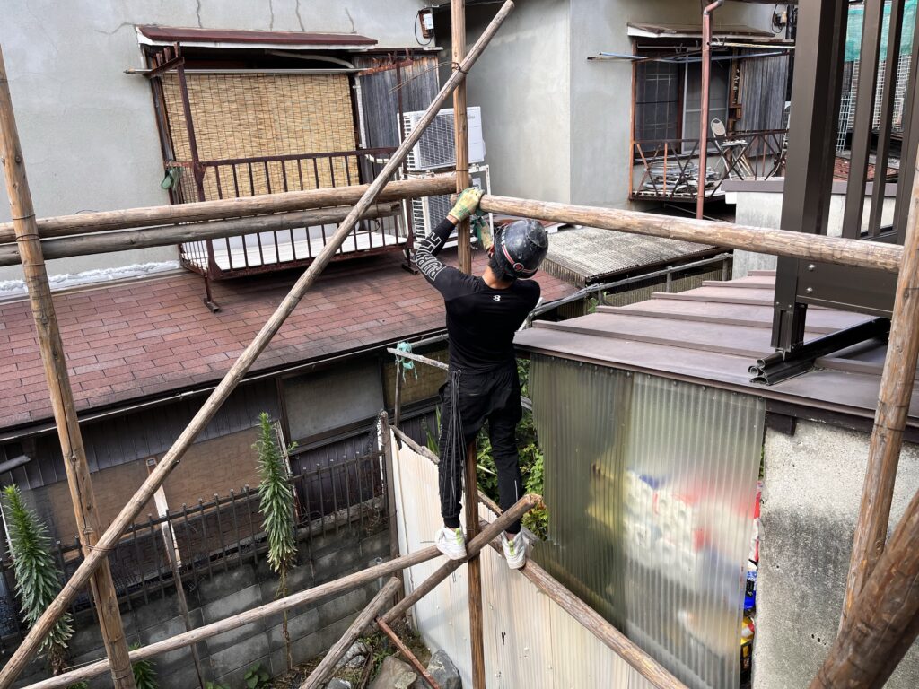 本日、京都府宇治市小倉町にて2階建て木造家屋解体工事を開始しました。近隣の挨拶、掃除が終わり足場組みにとりかからせていただきました。両隣が近いこともあり、慎重に養生をしながら進めていきました。この足場を組む作業はこの先作業を進めていく上で1番重要な事で、この作業を疎かにしてしまうと後々重機で隣の壁に当ててしまったり、2階の壁等倒す際外壁が隣の敷地に落ちたりします。弊社では、足場を組む工程から念入りに作業し、安全第一で工事に取り組んでおります。